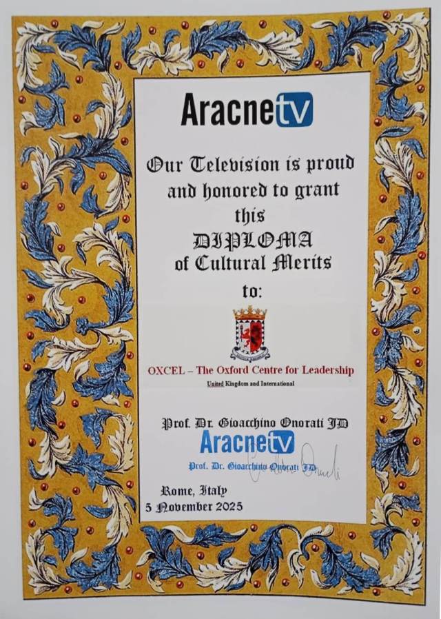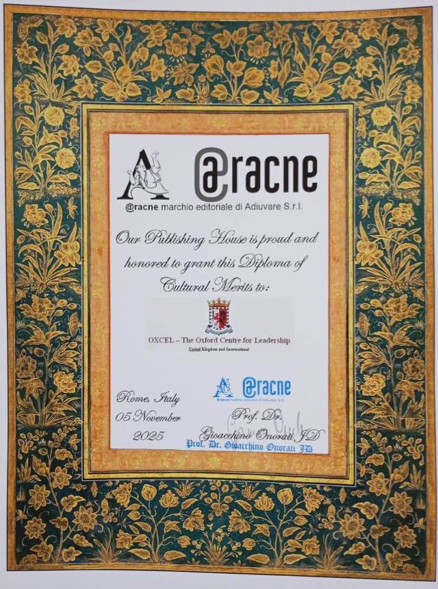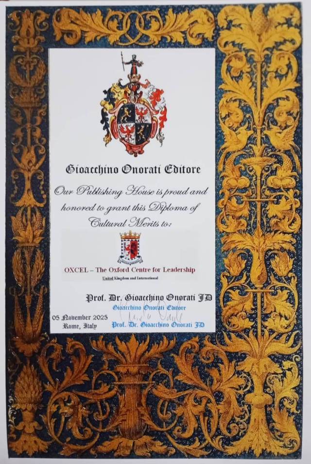 OXCEL has received Diplomas of Cultural Merits from the publishing houses Aracne Editrice, La Bussola Edizioni and Aracne TV, based in Rome, Italy, and their founder Prof. Dr Gioacchino Onorati.