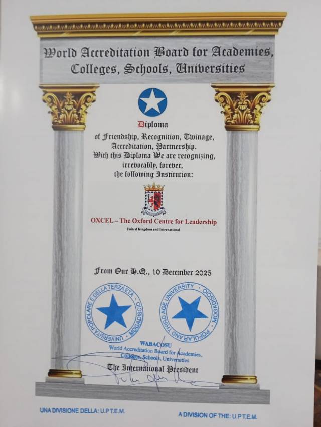 OXCEL has recently received accreditation from the World Accreditation Board for Academies, Colleges, Schools, Universities (WABACOSU), Rome, Italy. WABACOSU is a division of the Università Popolare e della Terza Età “Mogadiscio” established to further high and humane standards in the provision of education, particularly for adults. OXCEL has entered into a mutual full agreement of friendship, recognition, twinning, accreditation and partnership with WABACOSU.